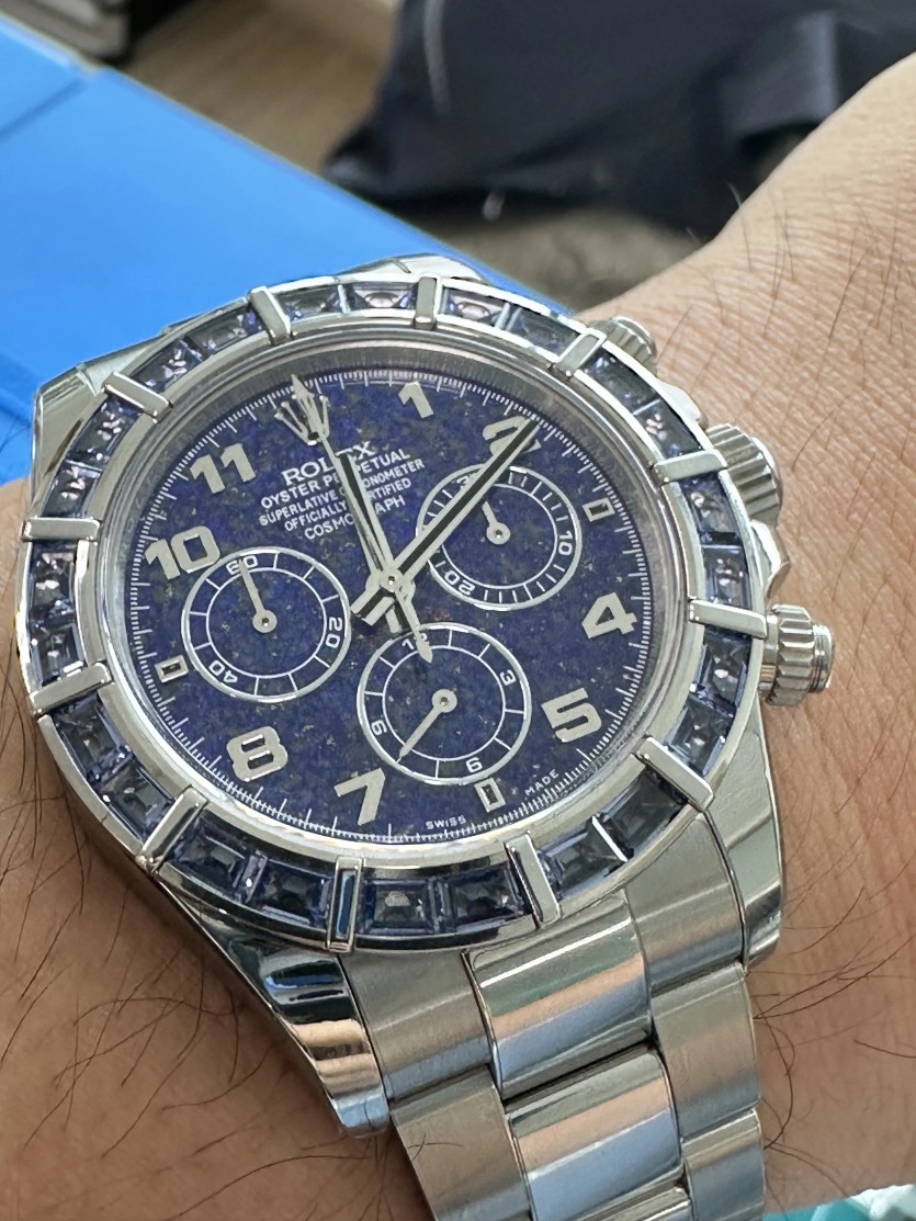 데이토나 청금석(Lapis Lazuli) 아라빅 화이트골드용 다이얼+모이사나이트 베젤+커스텀 핸즈 장착샷