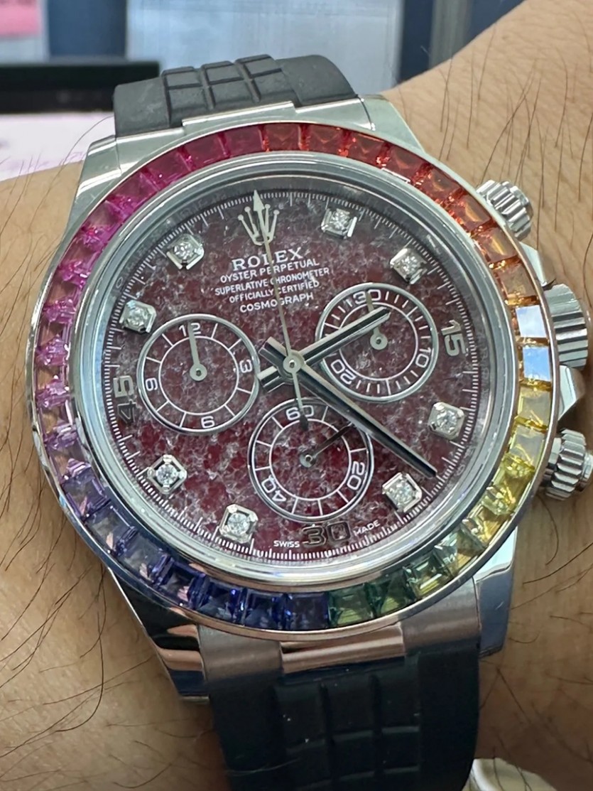 데이토나 루벨라이트 8p 다이얼+커스텀핸즈+레인보우 모이사나이트 베젤 장착 샷
