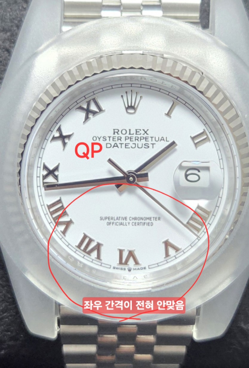 12월 11일 제품 받고 가족여행,연말행사 등등 바쁘게 지내다가 오늘 간만에 한가해서 줄 줄일려고 꺼냈다가 심각한 결함을 발견 했네요. 6시 로만 인덱스가 전혀 엉뚱한곳에 붙어 있네요. (실물로 보면 심하게 완전 쏠림)